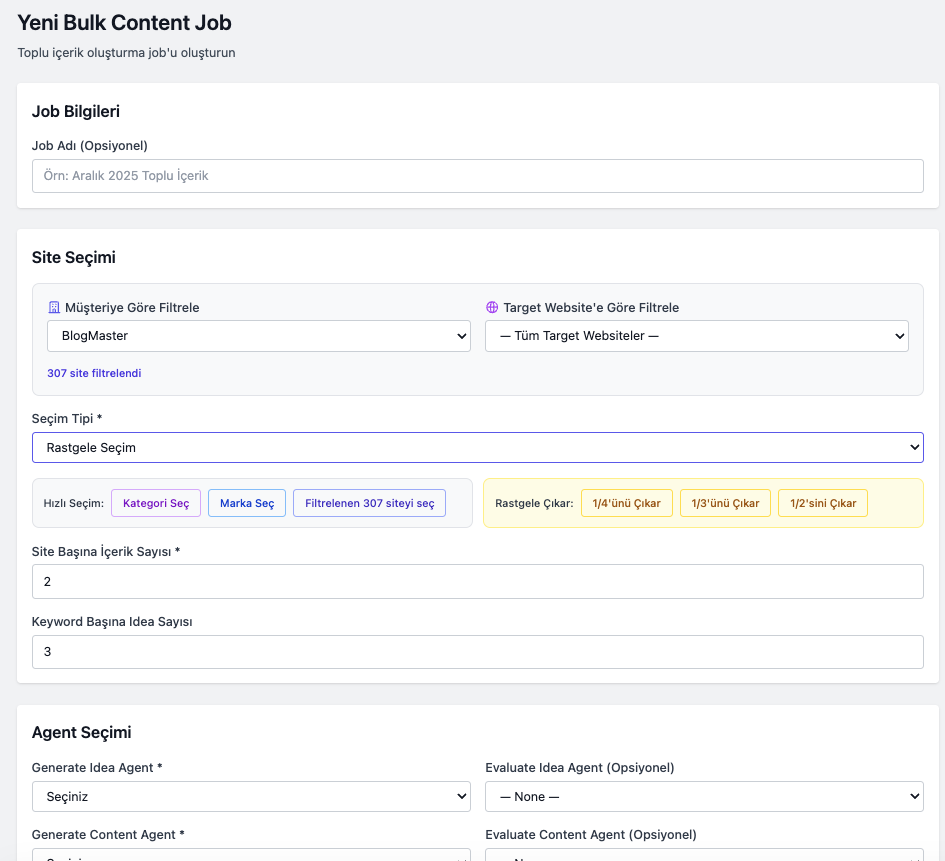 Birden fazla site için toplu fikir + makale üretimi. Agent seçimi, kuyruk ve başarısız site raporu.