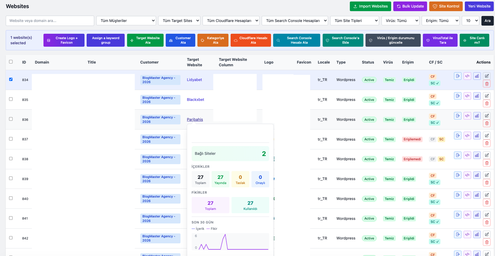 Siteleri seçin; Cloudflare ekleme, virüs kontrolü, Search Console ve daha fazlası tek tıkla.
